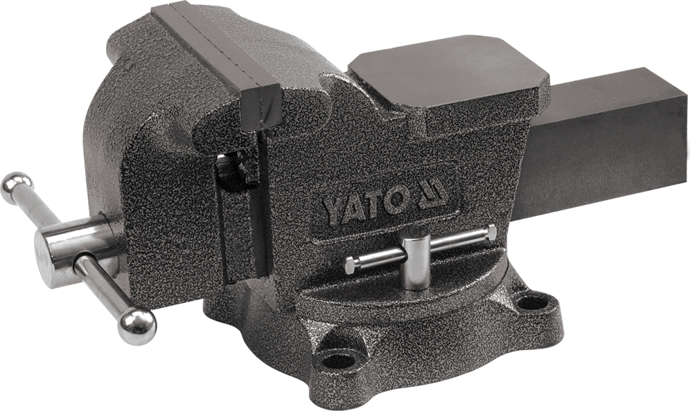 Vise body made of gray cast iron, replaceable jaws 100 mm and anvil of hardened steel. Trapezoidal threaded lead screw fully protected. Turntable mounted vise. Surface covered with black "hammer" lacquer.