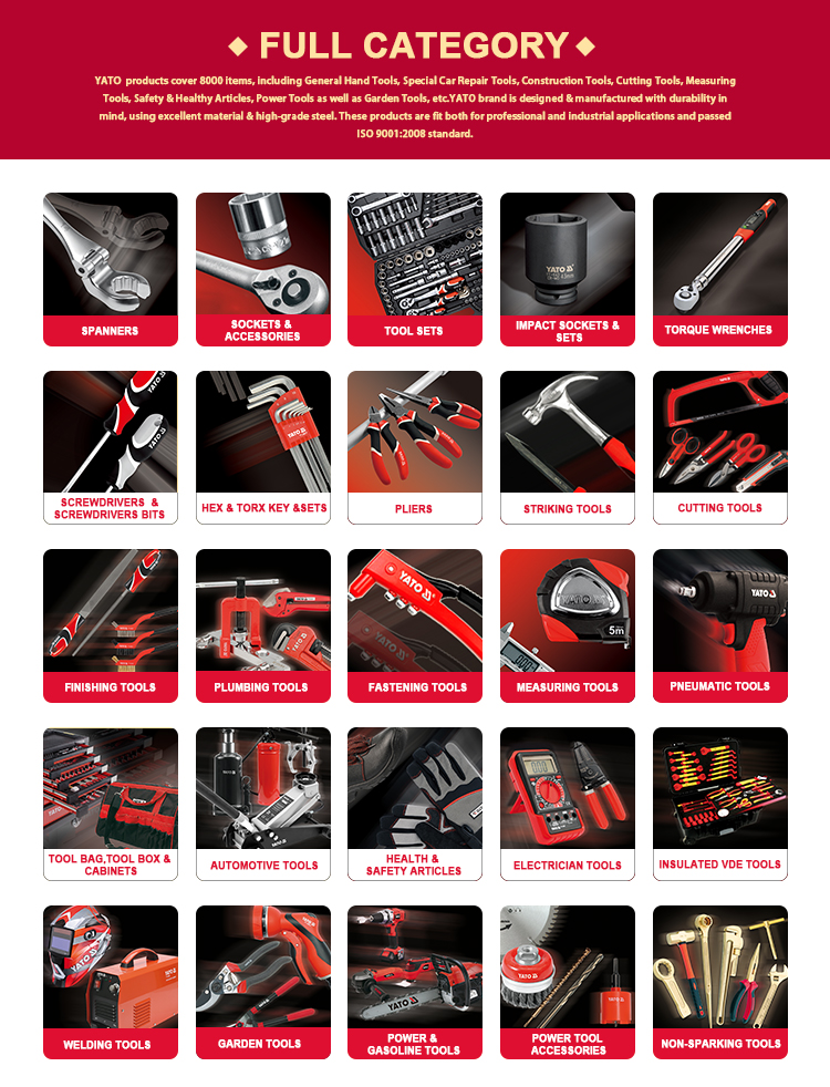 Durability, perfection of execution, excellent materials and high quality steel are the main technical features of YATO products, which can be used in three fields: car repair workshops, construction and garden. Hand and pneumatic YATO tools are successfully used by specialists from many fields of industry. Unique durability and resistance of YATO tools destined them for heavy duty industry and service applications.